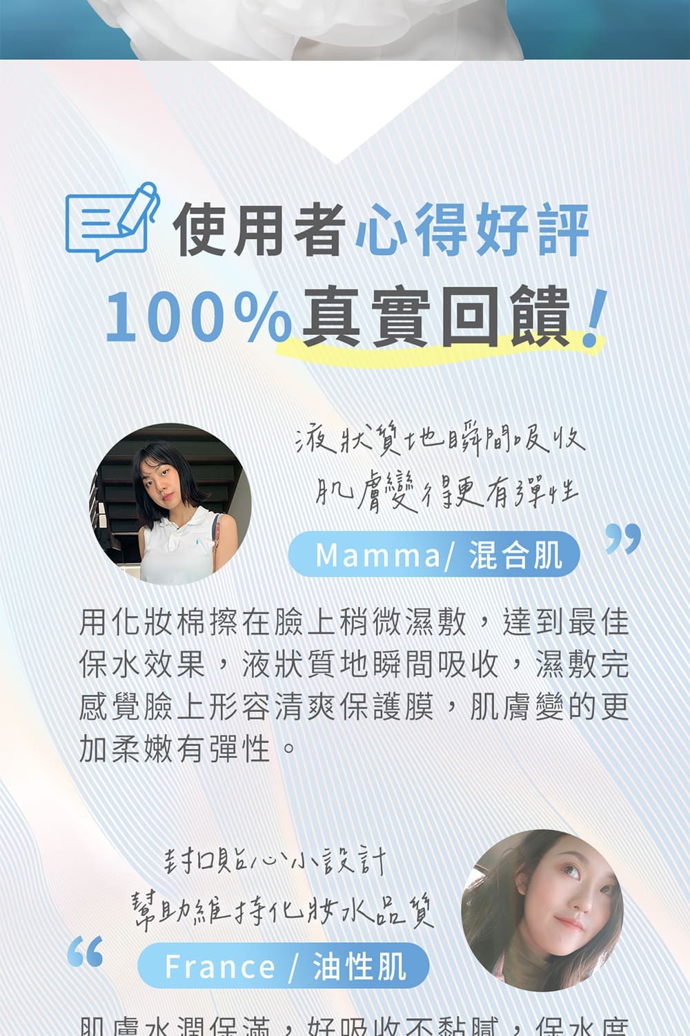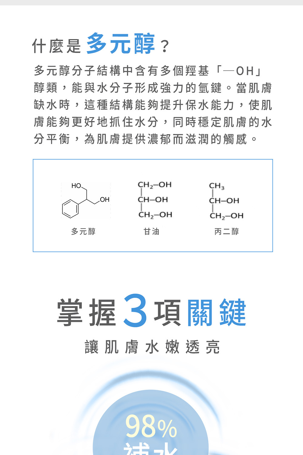 將玻尿酸結合多元醇,幫助肌膚留住水份,提升保養基礎。濕潤角質層,鎖水、保濕並使肌膚柔嫩有彈性。