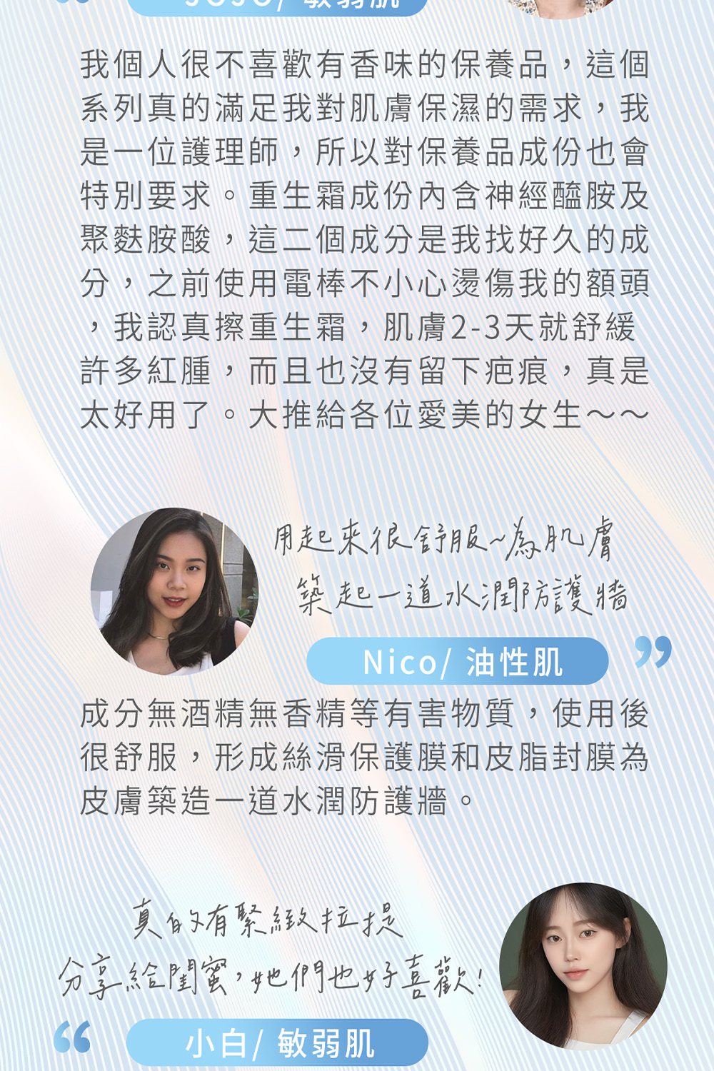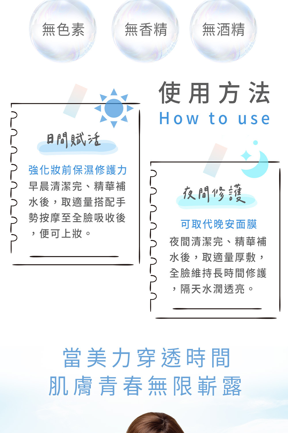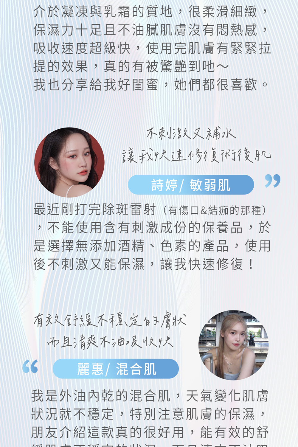 具備薄透清爽觸感的同時,保有霜類的修復與防護功能,形成絲滑保護膜和皮脂封膜,協助保濕補水喚醒表皮活力。